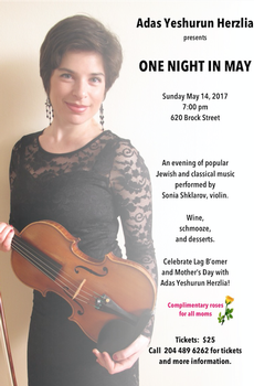 Join us on Sunday, May 14, at 7:00 pm as Adas Yeshurun Herzlia presents ONE NIGHT IN MAY, a spring fun-raiser featuring popular Jewish and classical music performed by the WSO’s Sonia Shklarov on violin. Wine, schmoozing, a proper Winnipeg sweet table, and complimentary roses for all moms promise this will be an unforgettable event.