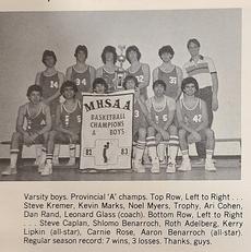 Kerry Lipkin, based in Philadelphia, who coached the 85-86 JWC team wrote to the Winnipeg Jewish Review that the " most significant theme from coaching the 85-86 was that group of players gave the utmost effort and bonded so nicely as a team.  Their collective attitudes along with great leadership from Coach Grant Rimer allowed us to achieve our potential and win.  This was very satisfying for me to win this year as the 84-85 team fell short and didn't make the Provincial Tournament as the favorite team.  The lessons learned about life was very helpful to me in being able to set goals and work hard."