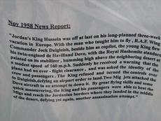 A sign next to this same plane [see my photo of it, with the exact wording] indicates that in 1958 there was an assassination attempt against King Hussein [the young grandson who became King] but it again does not explain who was trying to assassinate him. The context is that King Hussein, who was a pilot, decided to take a holiday in Switzerland, and chose to fly this same plane. While flying over Syria, the aircraft was attacked by two Syrian Mig-17 fighters, and ordered to land in Damascus. Hussein disregarded the order, and out manoeuvred the Syrian jets, escaping assassination. The Museum's narrative is that "Two Mig jets attacked the Dove aircraft in an attempt to down it", failing to mention that they were Syrian migs.