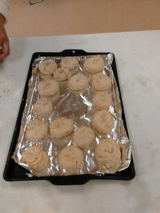 Sprinkle dough with oil. Place filling along edge. Roll up. Cut dough with sides of hand with a sawing motion stretching dough around cut. Place on lined cookie sheet on cut side. Bake at 3500 about 25 minutes.