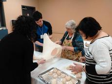 Roll dough on a well floured clean table cloth. Using the back of hands under dough, stretch until thin. Stretch further by pulling dough around edges with fingers, until paper thin.
