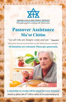 Each year, Jewish Child and Family Service (JCFS) distributes Ma’ot Chitim hampers to JCFS clients, but also to many families who have themselves requested additional assistance to help meet the higher costs of Passover food. JCFS accepts requests from any community member needing Passover assistance.