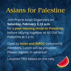 Prairie Asian Organizers invites Asian, Indigenous, Black, and other racialized community members to join us for lunch and a peer learning circle for Palestine on Saturday, February 3, 11am at Sam Po Dim Sum Restaurant (277 Rupert Ave). Lunch will be generously provided by the UM Institute for Humanities.
